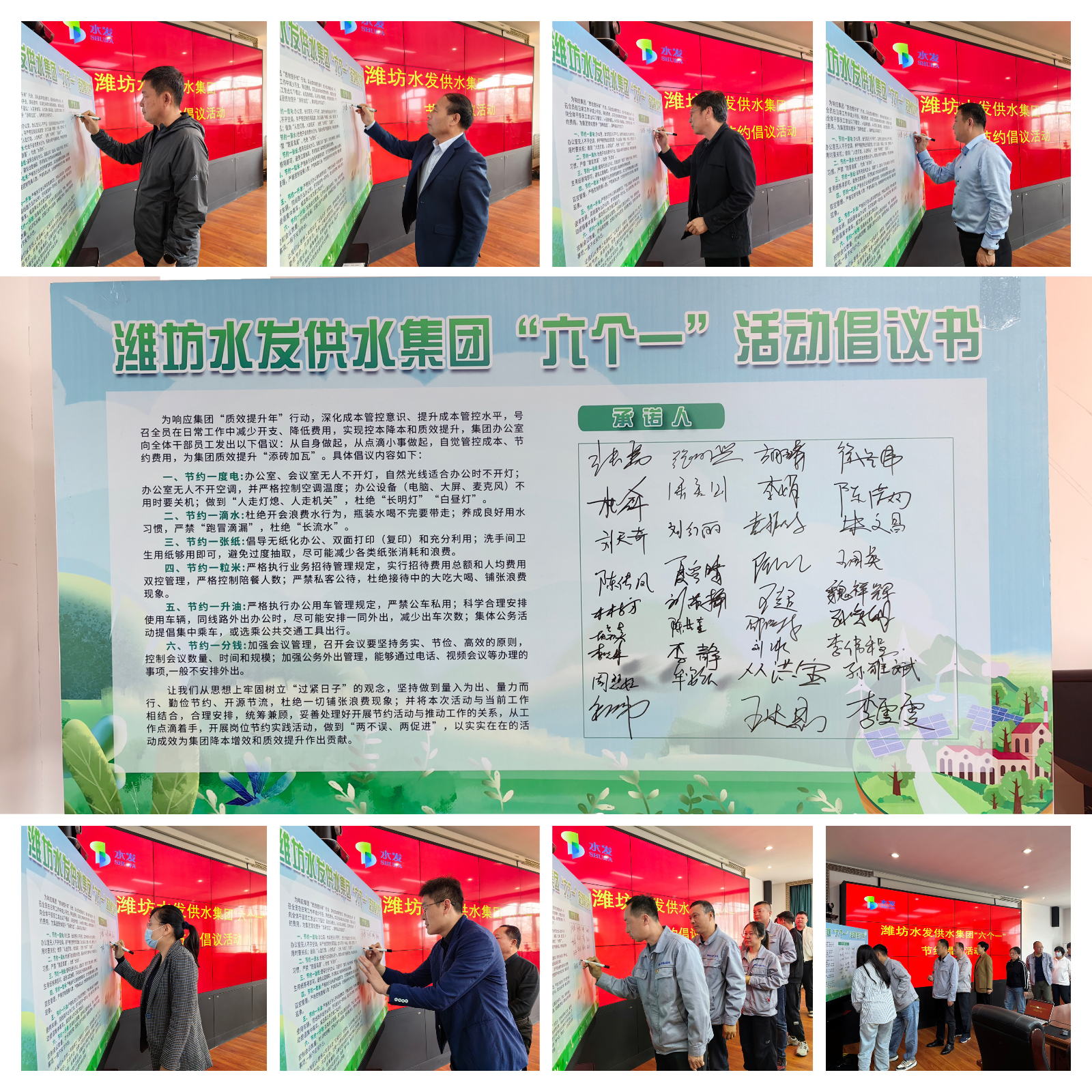 會上,供水集團(tuán)黨總支書記、董事長張勇首先宣讀了“六個(gè)一”活動(dòng)倡議書,號召全體員工提升降本增效意識,爭做勤儉辦公、節(jié)能降耗的先進(jìn)模范。隨后,供水集團(tuán)領(lǐng)導(dǎo)班子成員及參加活動(dòng)的干部職工紛紛在活動(dòng)展板上簽上自己的名字,承諾自覺踐行“六個(gè)一”節(jié)約倡議。